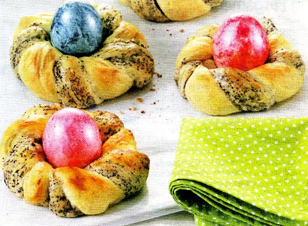 | Im vorgeheizten Backofen bei 200 Grad (Umluft: 180 Grad) circa 20 Minuten backen. Unmittelbar nach dem Backen in jedes Mohnnest 1 buntes Ei drücken |