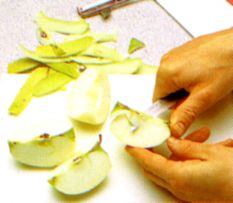Durchmesser) fetten. Den Apfel schälen, vierteln, entkernen und in Spalten