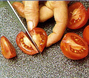 | Die Tomaten waschen und halbieren, den Stengelansatz herausschneiden. In Spalten schneiden. | ![]() |