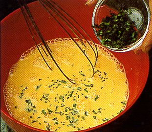 | Einige Petersilienblättchen abzupfen, die restlichen fein hacken. Die Eier mit der Sahne verquirlen. Mit gehackter Petersilie, Salz und Pfeffer kräftig würzen. | ![]() |