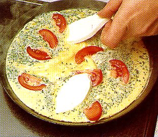| Die Pfanne dann rütteln, Tomaten, Mozzarella und die Petersilienblättchen auf das Omelett geben. Zitronenpfeffer darüber streuen, bei milder Hitze zugedeckt noch 3 Minuten garen. | ![]() |